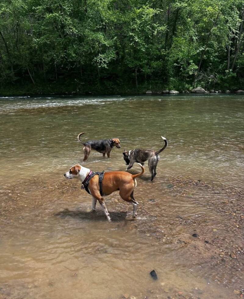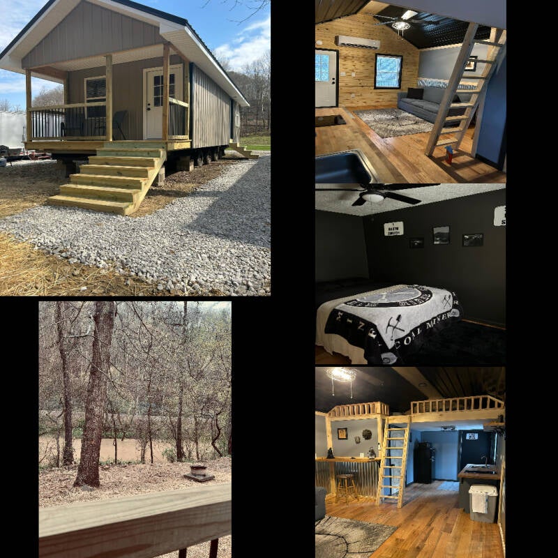 This cabin also holds up to 6 people. It has AC/Heating, a full bathroom (linens included), kitchen, living room (sleeper sofa), bedroom (linens included) (queen bed), and loft area (2 twin beds). The kitchen has a refrigerator, microwave, coffee pot, stove top, pots and pans, sink, dishes and utensils. This also includes an outdoor porch which overlooks the river and a firepit! Two night's stay is required when making reservations.